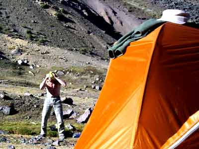 After some grief we managed to wedge our tents between others on a 30 degree slope.