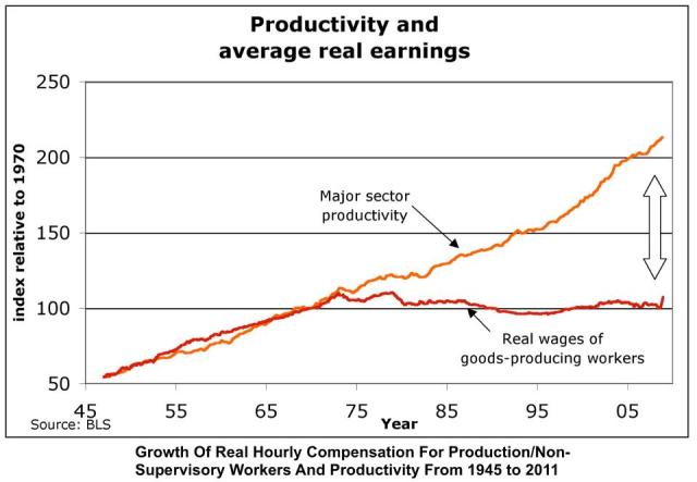 Maybe I’m seeing what I want to see but this graphic illustrates a point I’ve harped on for years: while increasing productivity can — in theory – produce better pay for workers, the people who decide the pay can always decide to keep the fruits of the productivity for themselves.