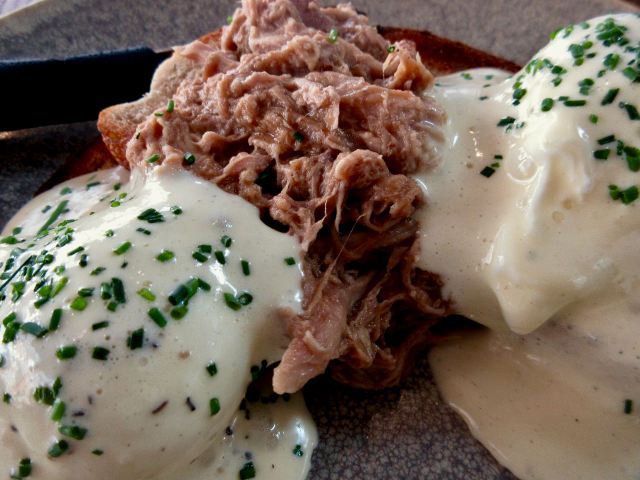 By far the busiest restaurant is Crwst (Crust). For lunch I had slow cooked pork & eggs benedict. Excellent.