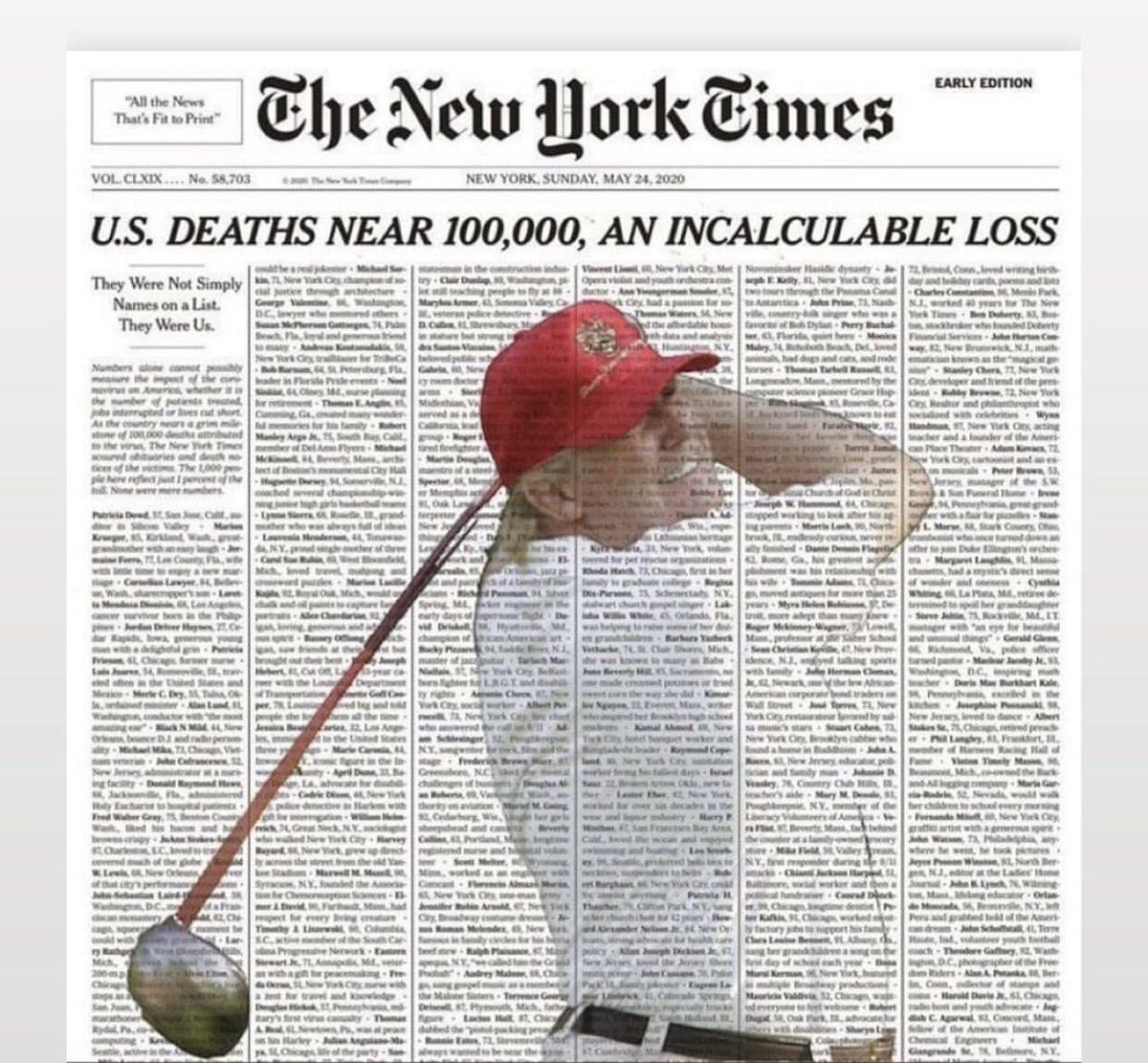 Trump golfs while Americans die On May 25, 2020 By Rick McIn ethics, government Share this: Click to share on Facebook (Opens in new window) Facebook Click to share on X (Opens in new window) X Click to print (Opens in new window) Print Click to email a link to a friend (Opens in new window) Email Like Loading...