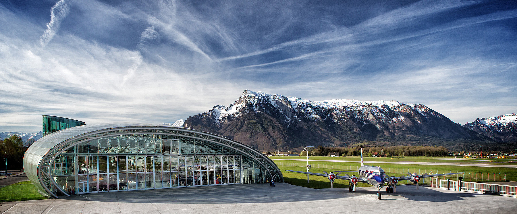 Hangar-7 in Salzburg, Austria, hosting a collection of historical airplanes, helicopters and Formula One racing cars, and serving as home for the Flying Bulls, a private aircraft fleet stationed in Salzburg.